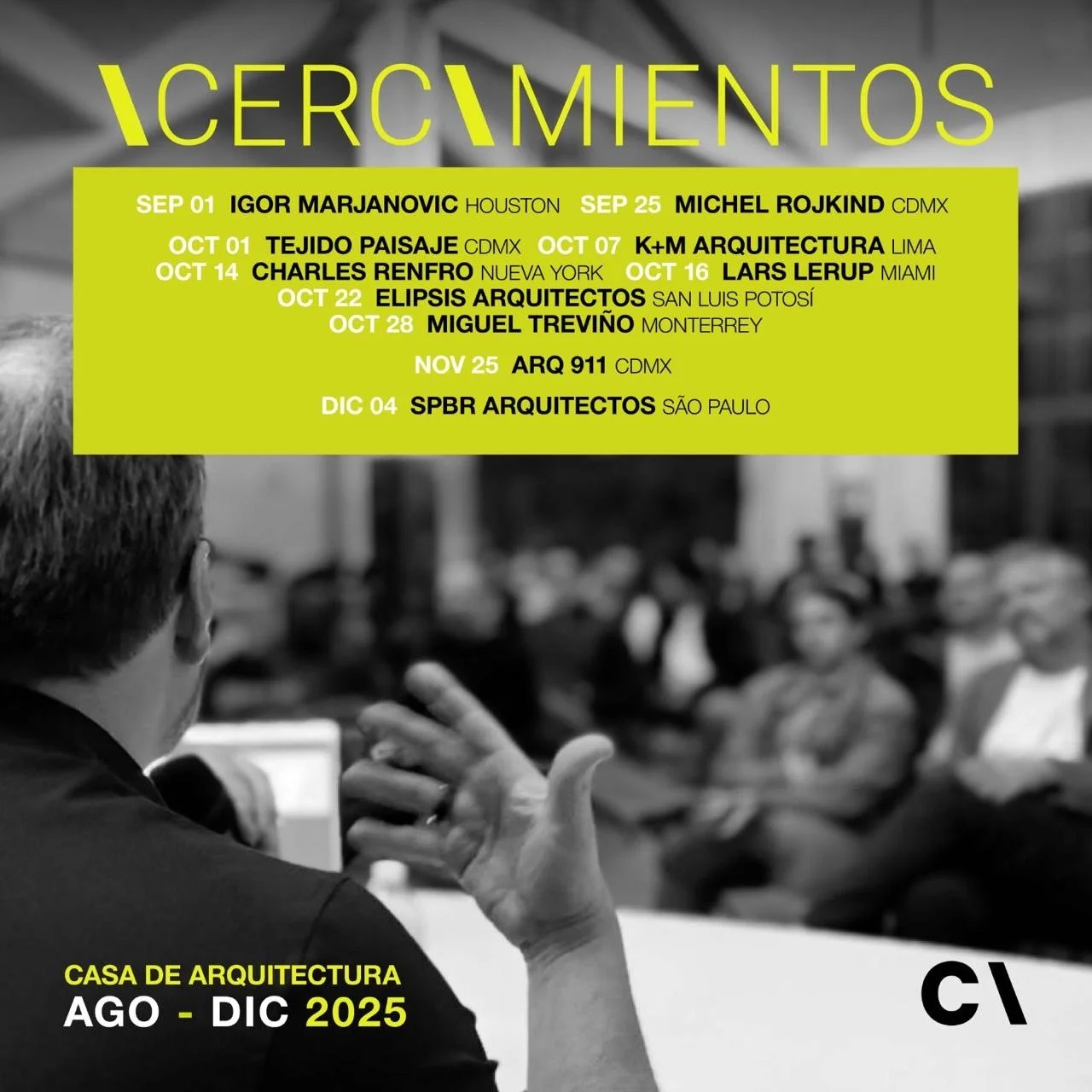 Ciclo de conversaciones. Detrás de la obra arquitectónica materializada, existen múltiples capas de experiencias, entendimientos y saberes que suelen no estar a la vista, que se hacen mas presentes cuando acercamos nuestra mirada y nuestros sentidos al contexto del creador, a sus intereses, sus miedos, sus rutinas, sus vivencias. “Acercamientos”, invita a revelar las posibles influencias que otras disciplinas, pasatiempos o actividades tienen en su conceptualización y desarrollo de obra arquitectónica.